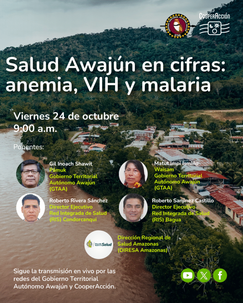 El Gobierno Territorial Autónomo Awajún (GTAA), en coordinación con las Redes Integradas de Salud de Condorcanqui y Bagua, la Dirección Regional de Salud de Amazonas (DIRESA Amazonas), con el apoyo de CooperAcción, presentarán el Tablero de Control de enfermedades prevalentes del pueblo awajún.