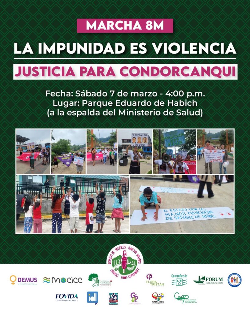 Las lideresas amazónicas convocarán a la ciudadanía, organizaciones sociales, colectivos feministas, pueblos indígenas, universidades, gremios profesionales y público en general a sumarse a la movilización del 7 de marzo, que contará con un bloque amazónico encabezado por mujeres indígenas bajo los mensajes: “Ni una niña más violentada. Justicia para Condorcanqui” y “La impunidad es violencia”.